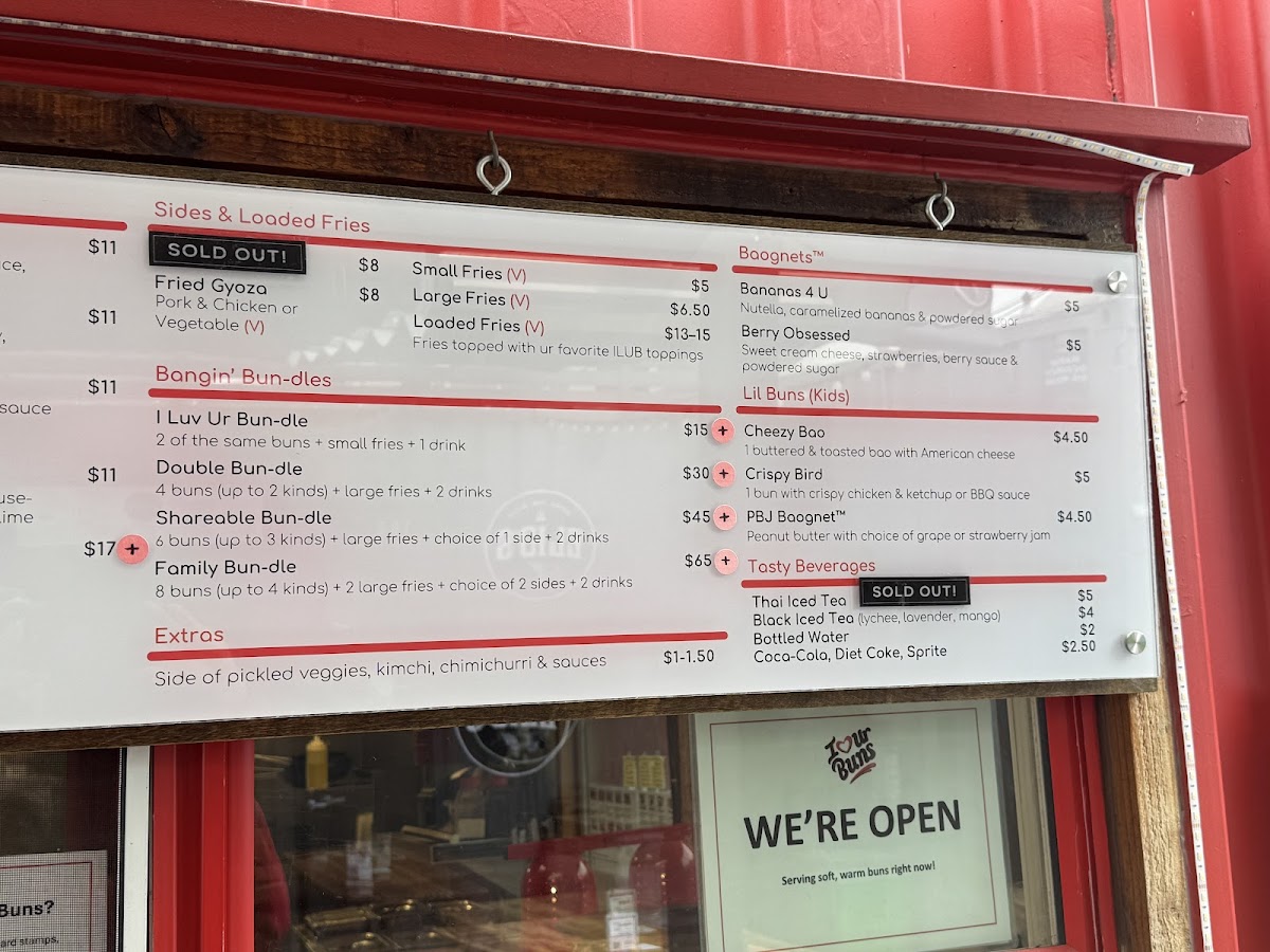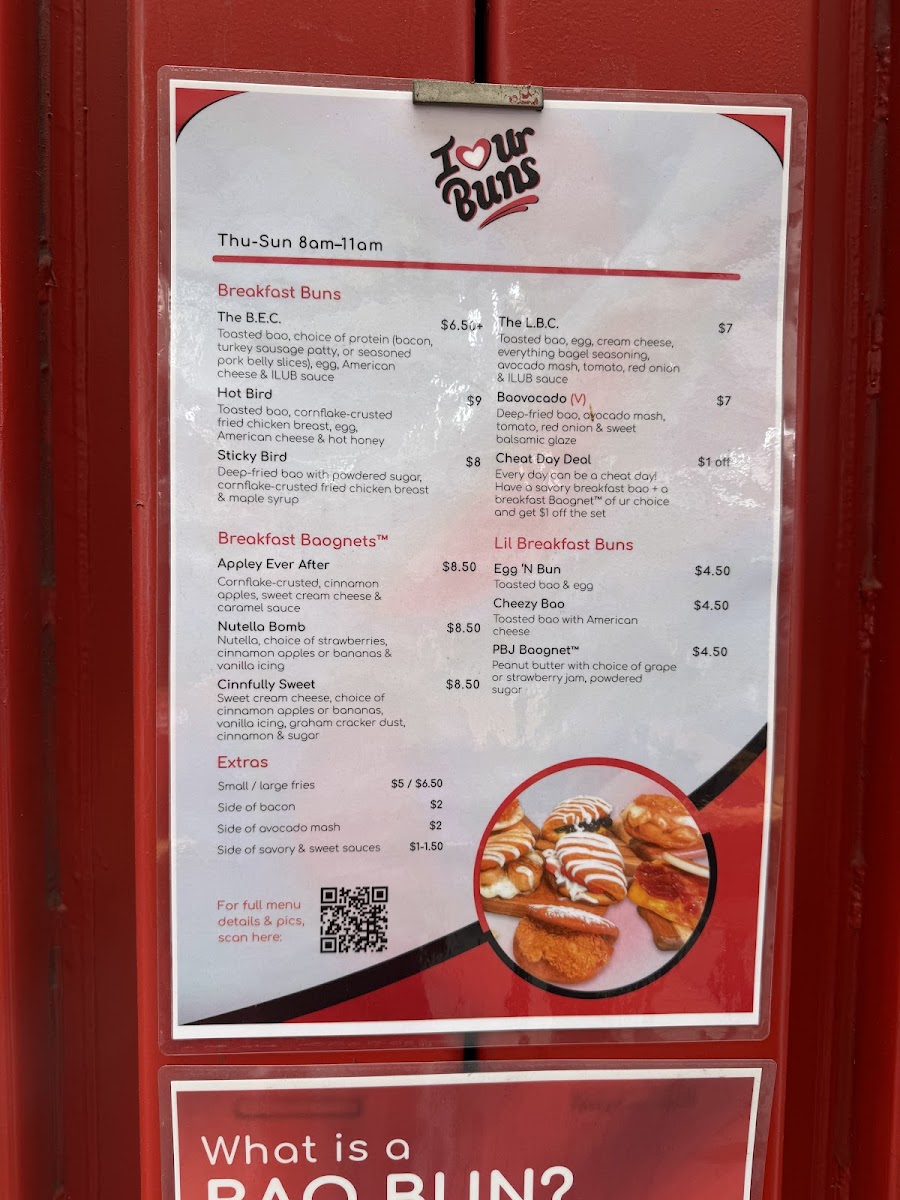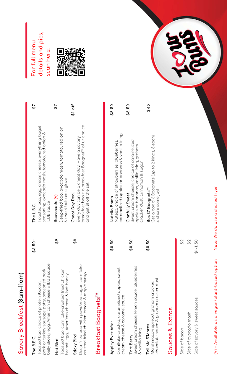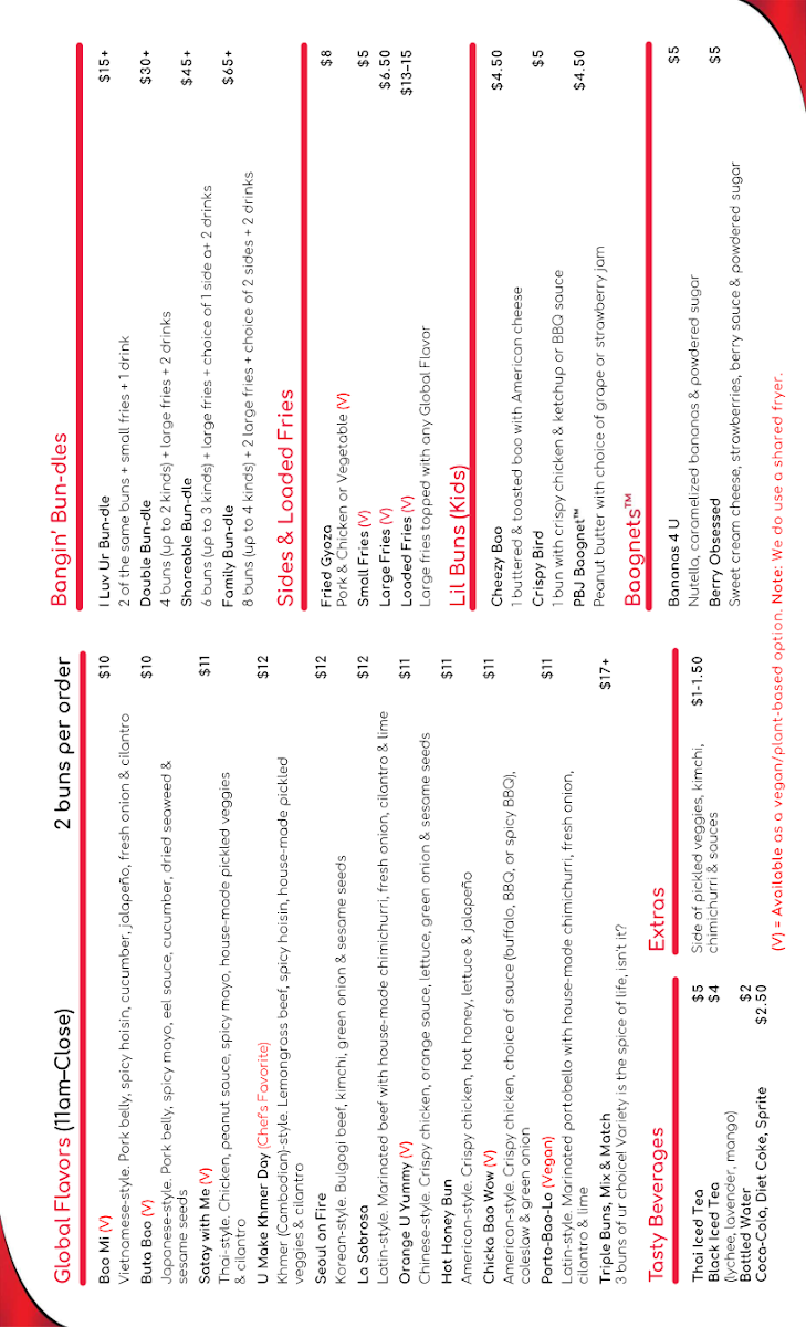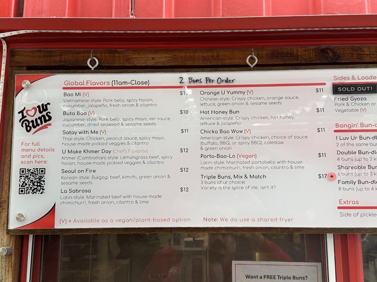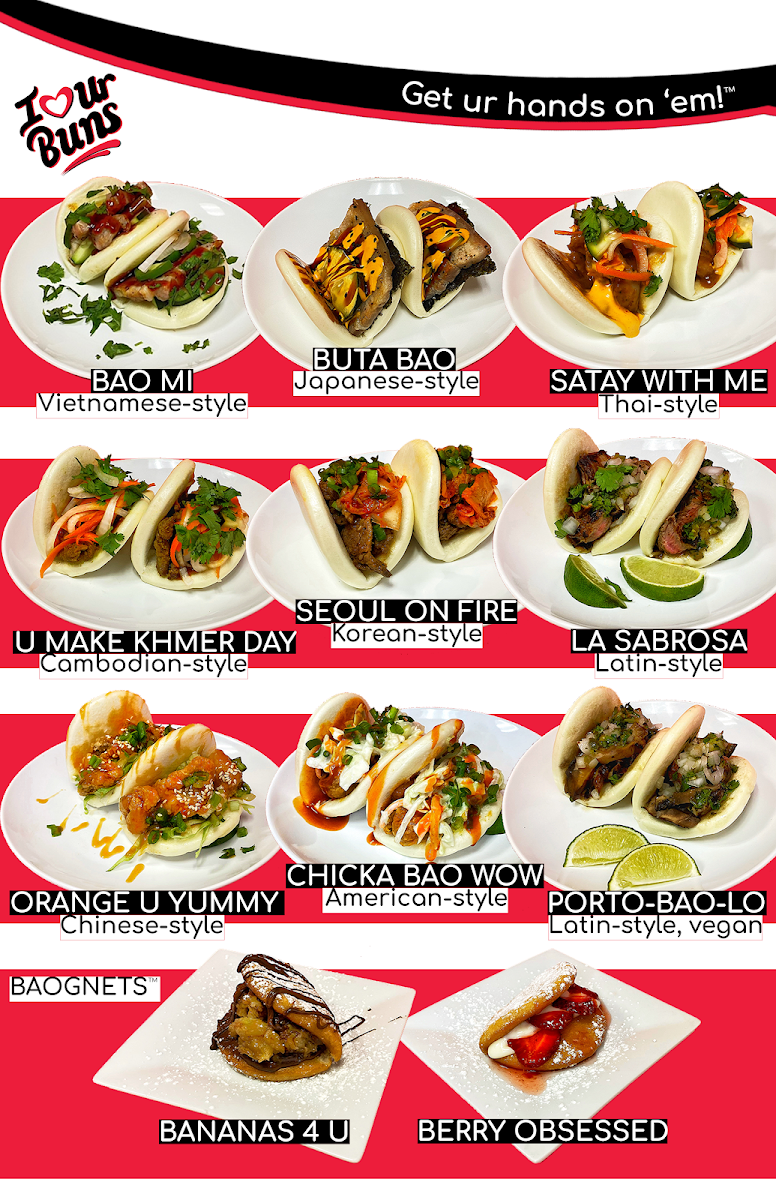 The menu at I Luv Ur Buns offers an exciting variety of both savory and sweet options, showcasing global flavors in a unique, bao-inspired format. For those with a sweet tooth, the Baognets! (sweet buns) come in tempting varieties like Baognet, Bananas 4 U Baognet, and Berry Obsessed Baognet. If you're in the mood for something shareable, their Bangin' Bun-dles include options like the I Luv Ur Bun-Dle, Double Bun-Dle, Shareable Bun-Dle, and the Family Bun-Dle. The Lil Buns menu caters to younger diners with fun dishes such as Crispy Bird and Cheezy Bao. For plant-based eaters, the Vegetarian/Plant-Based Options include flavorful choices like the Orange U Yummy (Tofu), Bao Mi (Tofu), Spring Rolls, Buta Bao (Tofu), and Buta Bao Loaded Fries (Tofu). The Sides & Loaded Fries feature a mix of options like Gyoza (Pork, Chicken, or Vegetable), and Small Fries. For a more global experience, you can try the Global Flavors section, offering Bao Mi (Vietnamese), Satay With Me (Thai), Buta Bao (Japanese), Orange U Yummy (Chinese), and Seoul On Fire (Korean). If you’re looking for something special, the Bun uv the Munth (BUTM) showcases Char Siu as a limited-time offering. Don’t forget to pair your meal with refreshing Lavender Iced Tea, Thai Iced Tea, or a classic Diet Coke. Lastly, the NEW Mini Bowls offer smaller, satisfying bowls like the U Make Khmer Day Mini Bowl and Buta Bao Mini Bowl, perfect for a quick but fulfilling meal. With a menu full of options, I Luv Ur Buns ensures there's something for every craving.